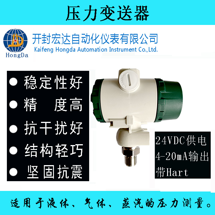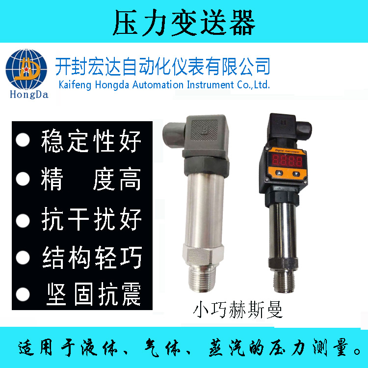 压力变送器是传感器芯体压力芯体检测元件片组装而成的。其结构坚固、外型抗冲击、振动、性能稳定、安装使用方便、体积小、重量轻等优点,能在各种正负压力测量中得到广泛应用。传感器信号经高性能电子放大器转换成0-10mA或4-20mA统一输出信号。可替代传统的远传压力表,霍尔元件、差动变送器。能与各类型的动圈式指示仪、数字压力表、电子电位差计配套使用,也能与号各种自动调节系统或计算机系统配套使用。